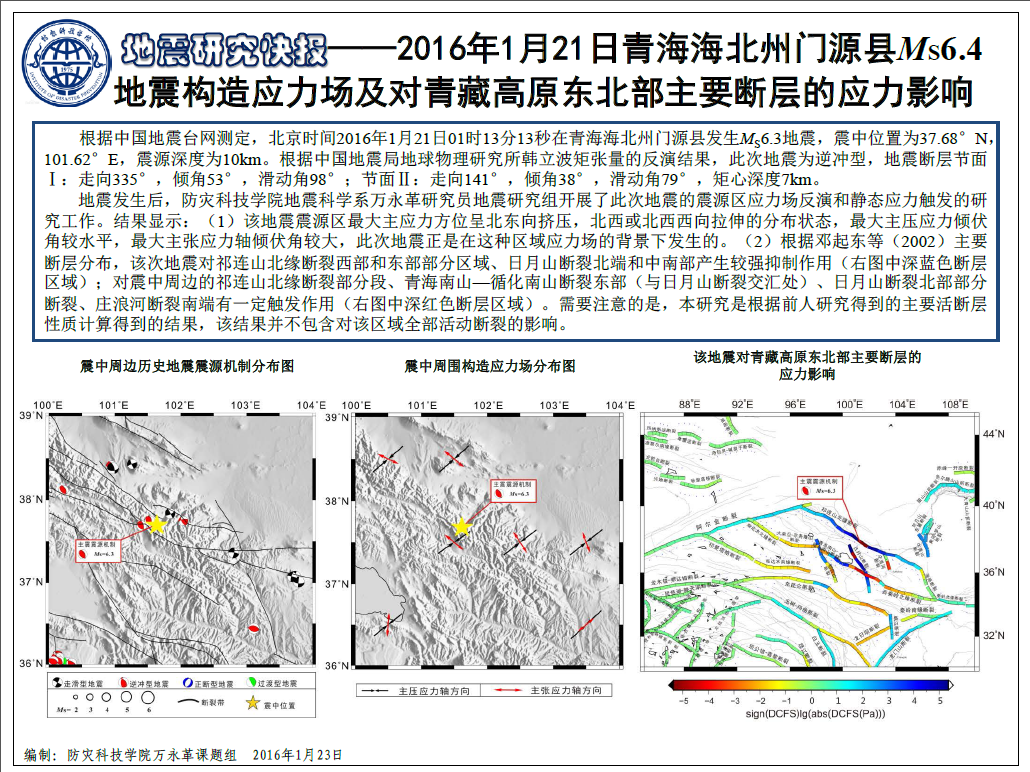 2016年1月21日青海门源县6.4级地震研究快报