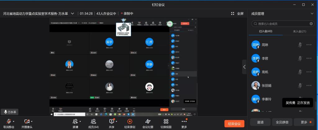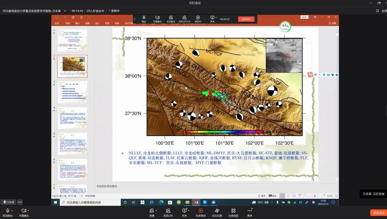 5月12日下午,kaiyun官方登录入口万永革教授利用钉钉线上会议为kaiyun官网师生做了题为“2022年门源地震序列揭示的断层几何及滑动性质”的学术报告。校内外部分师生参加了报告会,报告会由地球物理学教研室主任谭萍主持。