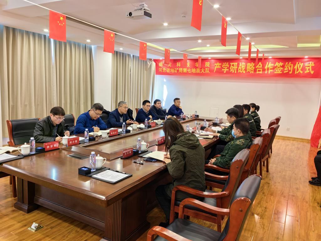 任云生简要介绍了学校的办学条件、学科专业、办学特色,指出学校与河北省地矿局相关单位,特别是与第七地质大队有着具备良好的合作基础,双方事业发展和服务国家需求方面有着相似的目标和方向,两单位同处一城,有得天独厚的合作优势,双方深度开展产学研合作对人才培养、科技创新、成果转化、学科平台建设等具有重要意义,学校将根据合作需求积极提供相关政策及保障措施,希望双方能够发挥各自优势,在重点实验室建设、技术研发、科技前沿研究、生产项目推进等方面取得丰硕成果,不断拓宽合作领域,深化科教融合、产教融合、协同创新、协同育人,不断取得新的合作成果。