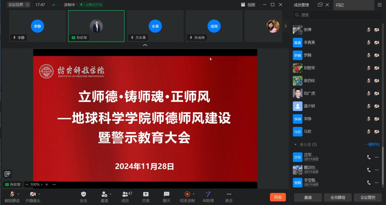 为进一步加强师德师风建设,提升教师队伍整体素质,kaiyun官网于2024年11月29日通过钉钉线上会议的形式举办了以“立师德 铸师魂 正师风”为主题的师德师风建设暨警示教育大会。会议由学院副院长孙珍军主持,全体教职工参加了此次会议。