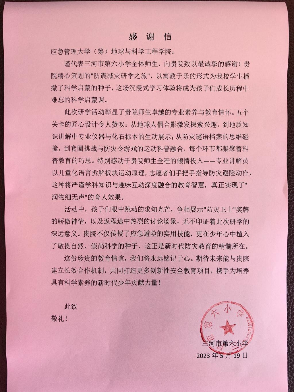 近日,开云kaiyun网站收到来自三河市第六小学全体师生的感谢信,信中高度评价了学院5月15日策划的“防震减灾研学之旅”活动,并对kaiyun官网师生在活动中表现出的专业素养与教育情怀表达了诚挚谢意。