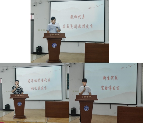 典礼在庄严的国歌声中拉开帷幕。会上,教师代表关成尧副教授发言,从德育、学业、身心健康、综合素质等方面对新生提出殷切期望,既要仰望天空、也要脚踏实地,语言生动、寄语真挚。随后,高年级优秀学生代表230121班张艺豪同学分享了自己的成长经历与学习心得,鼓励学弟学妹勇于追梦、脚踏实地。新生代表250112班宣皓博同学发言,表达了对大学生活的憧憬与决心,承诺将刻苦学习、不懈奋斗,为学院和学校争光。