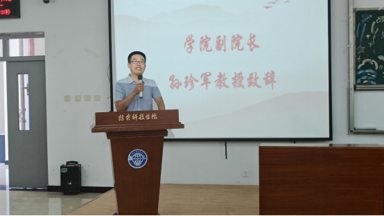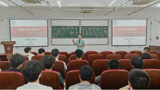 最后,学院主持工作副院长孙珍军教授致辞。他从学院历史沿革、人才培养、学科建设、师资队伍、产学研合作、基地建设、创新创业教育等多方面全面介绍了学院情况以及学院近年来的发展态势和未来规划,对新生提出了四方面的希望:一是平心静气、把书读透,要扎实学好专业知识;二是学以致用、把事做实,提高动手能力和实践能力;三是传承精神、把心立正,坚定理想信念、继承和发扬学院,努力成为地学英才;四是珍爱生命、把身练强,拥有健康的体魄和阳光的心态。