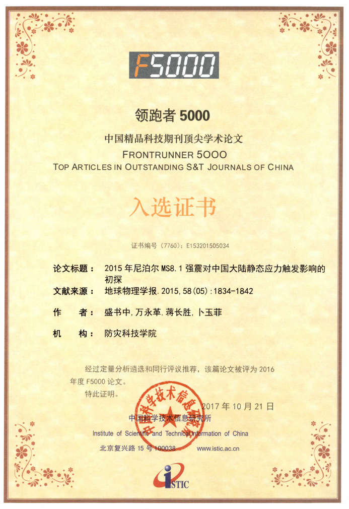 2017年中国科学技术信息研究所公布的2016年度“领跑者5000——中国精品科技期刊顶尖学术论文(F5000)”,我系盛书中副教授为第一作者撰写发表的“2015年尼泊尔MS8.1强震对中国大陆静态应力触发影响的初探”论文入选,该论文发表在《地球物理学报》(2015年第58期)上,论文的资助项目为中国地震局教师基金项目(20140102) 、中央高校基本科研业务专项资金(创新项目团队资助计划) (ZY20110101) 和国家国际科技合作专项项目(2012DFG20510)。该论文为kaiyun官网第一篇入选F5000(即领跑者5000)的学术论文,入选F5000的论文需经过定量分析遴选和同行评议推荐。该文能够入选,说明其内容科学、严谨,反映该研究具有一定的创新性和较高的学术水平。