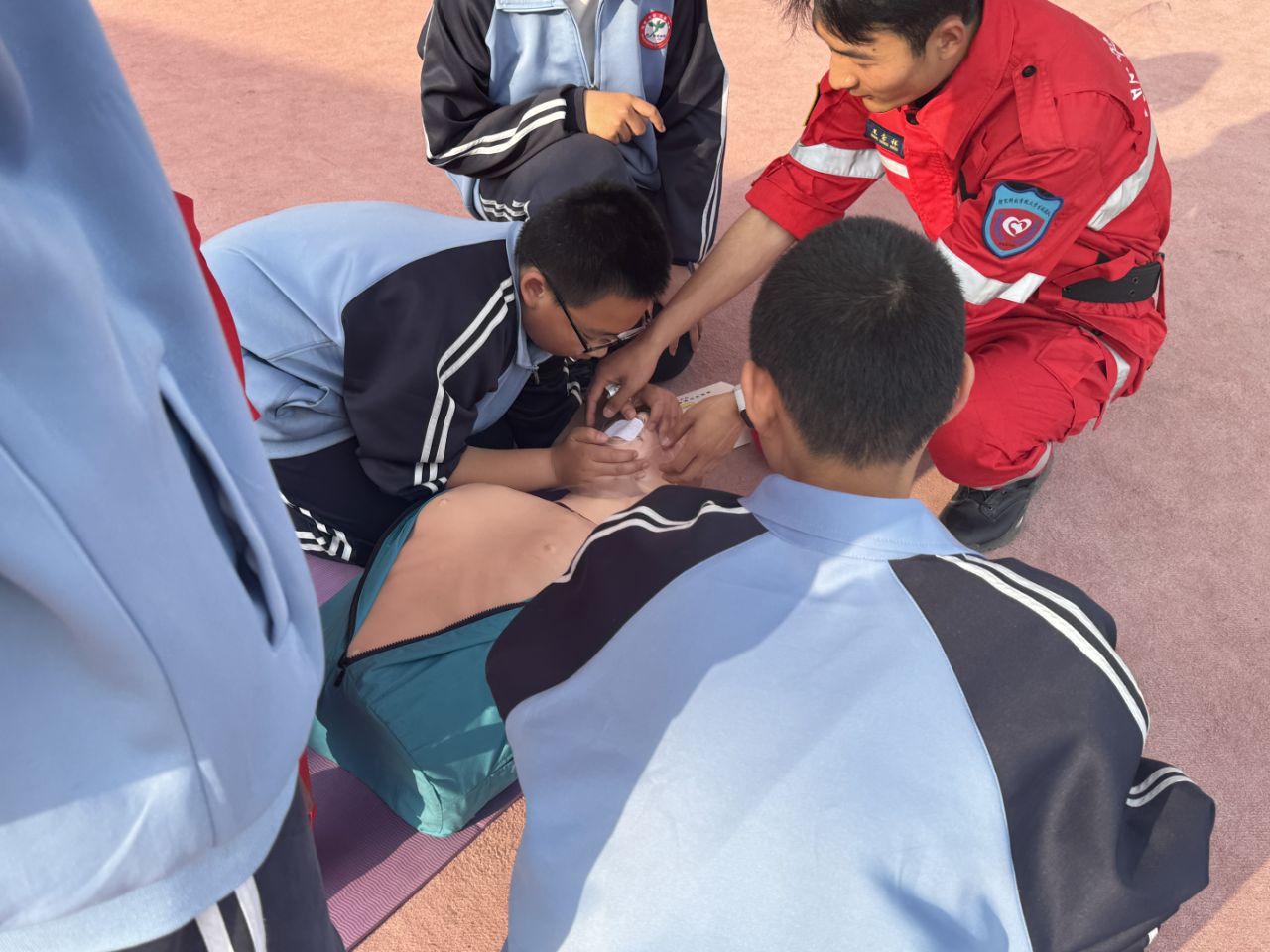 疏散集结后,学校陆地救援队向全体师生示范心肺复苏标准操作,并互动纠正按压姿势,随后通过优化撤离路线、增设分流引导员,完成第二轮疏散演练,疏散速度和队列规范度显著提高。