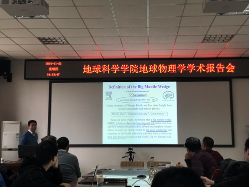 报告会上,雷建设研究员详细讲解了大地幔楔模型的概念,并展示了我国东北地区大地幔楔模型和青藏高原东缘大地幔楔模型的最新研究成果。报告会后,雷建设研究员与到会师生进行了深入交流。