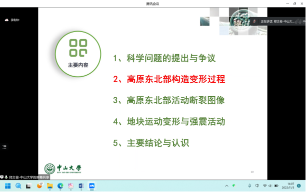 郑文俊教授为大家详细介绍了青藏高原东北缘地区研究现状和科学问题,并在目前最新研究认识的基础上,系统总结前人的研究成果,对高原东北部构造变形过程、活动断裂图像以及地块运动变形与强震活动等方面进行了介绍,最后郑文俊教授还结合自己工作与参会师生就该地区的构造变形和强震孕育特征等问题进行了交流与探讨。