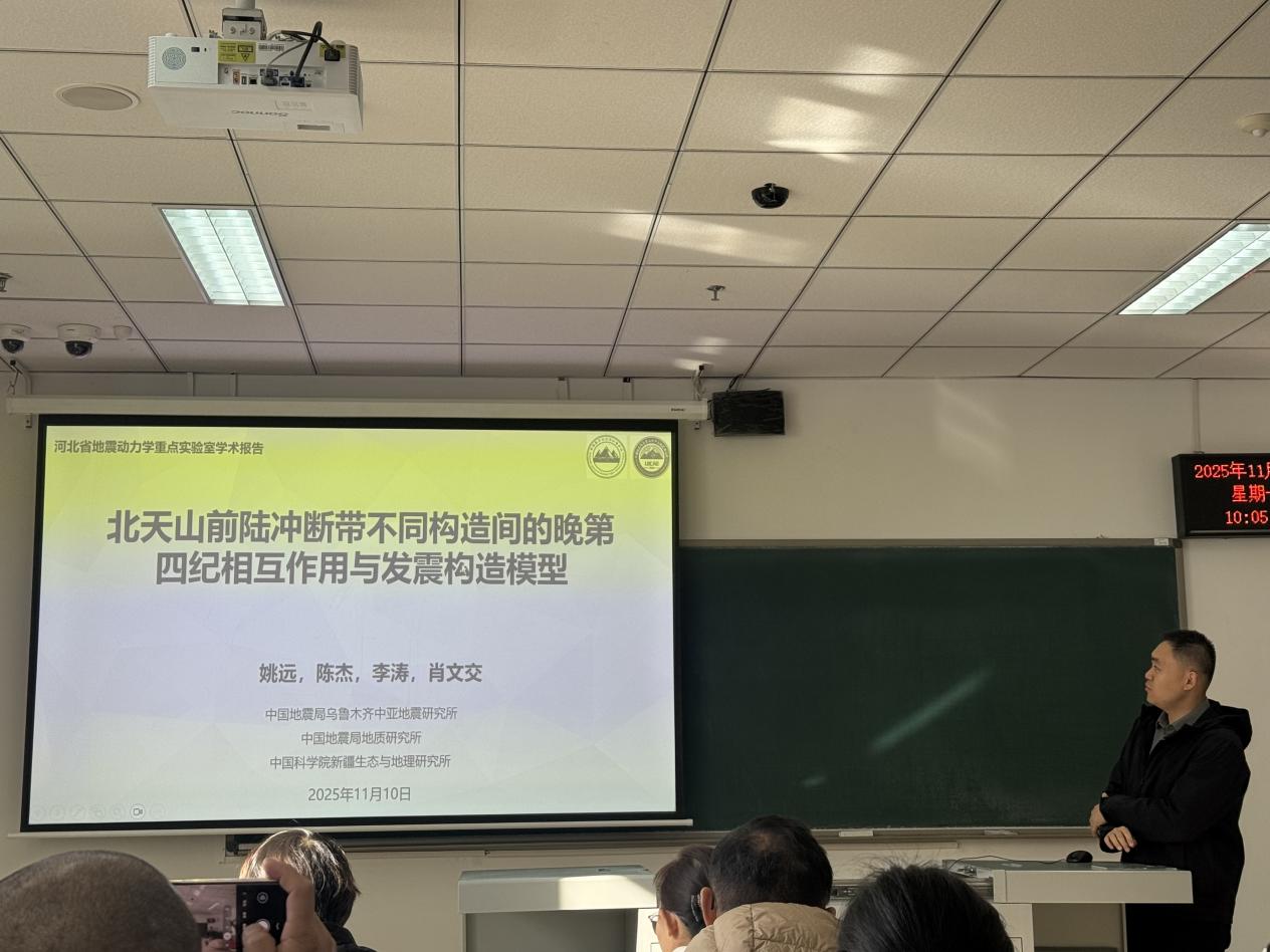 2025年11月10日上午,新疆地震局姚远研究员应河北省地震动力学重点实验室、廊坊市地球探测与信息技术重点实验室、开云kaiyun网站的邀请,为学校师生作了题为“北天山前陆冲断带不同构造间的晚第四纪相互作用与发震构造模型”的学术报告,开云kaiyun网站部分师生参加了学术报告会,报告会由吴传勇教授主持。